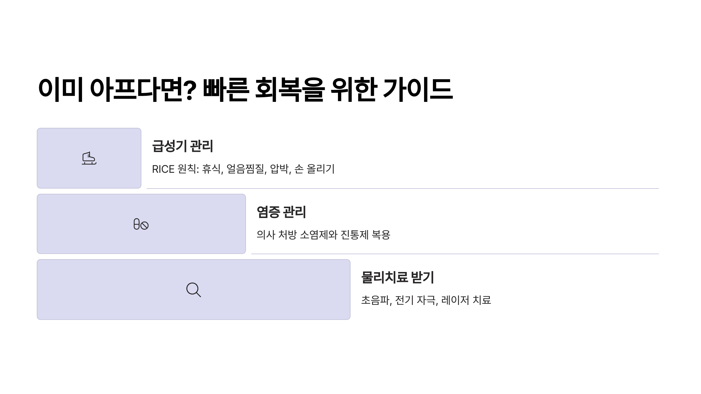 - 급성기 관리 (처음 48시간): RICE 원칙을 따르세요. Rest(휴식), Ice(얼음찜질), Compression(압박), Elevation(손을 심장보다 높게)을 의미해요. 저는 처음 이틀은 아예 컴퓨터 작업을 중단하고 얼음찜질을 4시간마다 15분씩 했어요.
