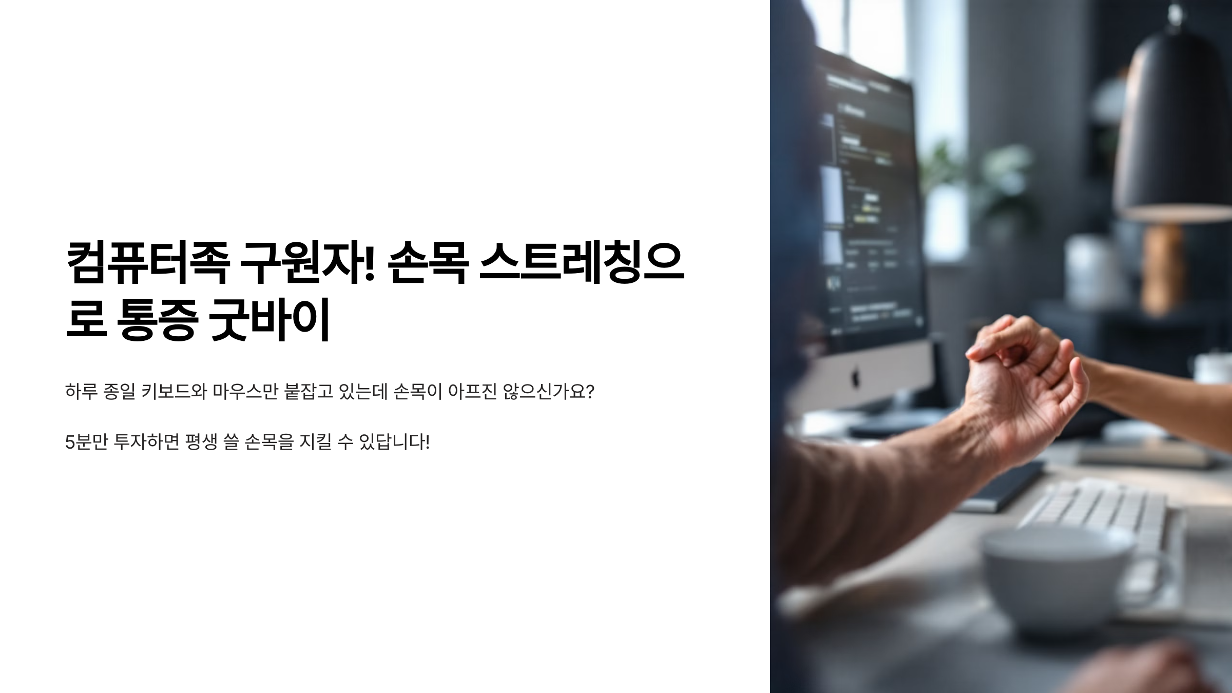 안녕하세요, 여러분! 저는 8년차 웹 개발자이자 한때 손목 터널 증후군으로 3개월간 일을 쉬어야 했던 경험이 있는 사람입니다. 그 고통스러웠던 시간 동안 전문의와 물리치료사를 만나며 배웠던 손목 관리법과 스트레칭을 여러분과 나누고 싶어요. 특히 요즘처럼 재택근무가 많아진 시기에는 사무실 환경보다 손목 관리에 소홀해지기 쉽더라구요. 저처럼 통증으로 고생하기 전에, 오늘부터 함께 손목을 지키는 습관을 만들어 봐요!