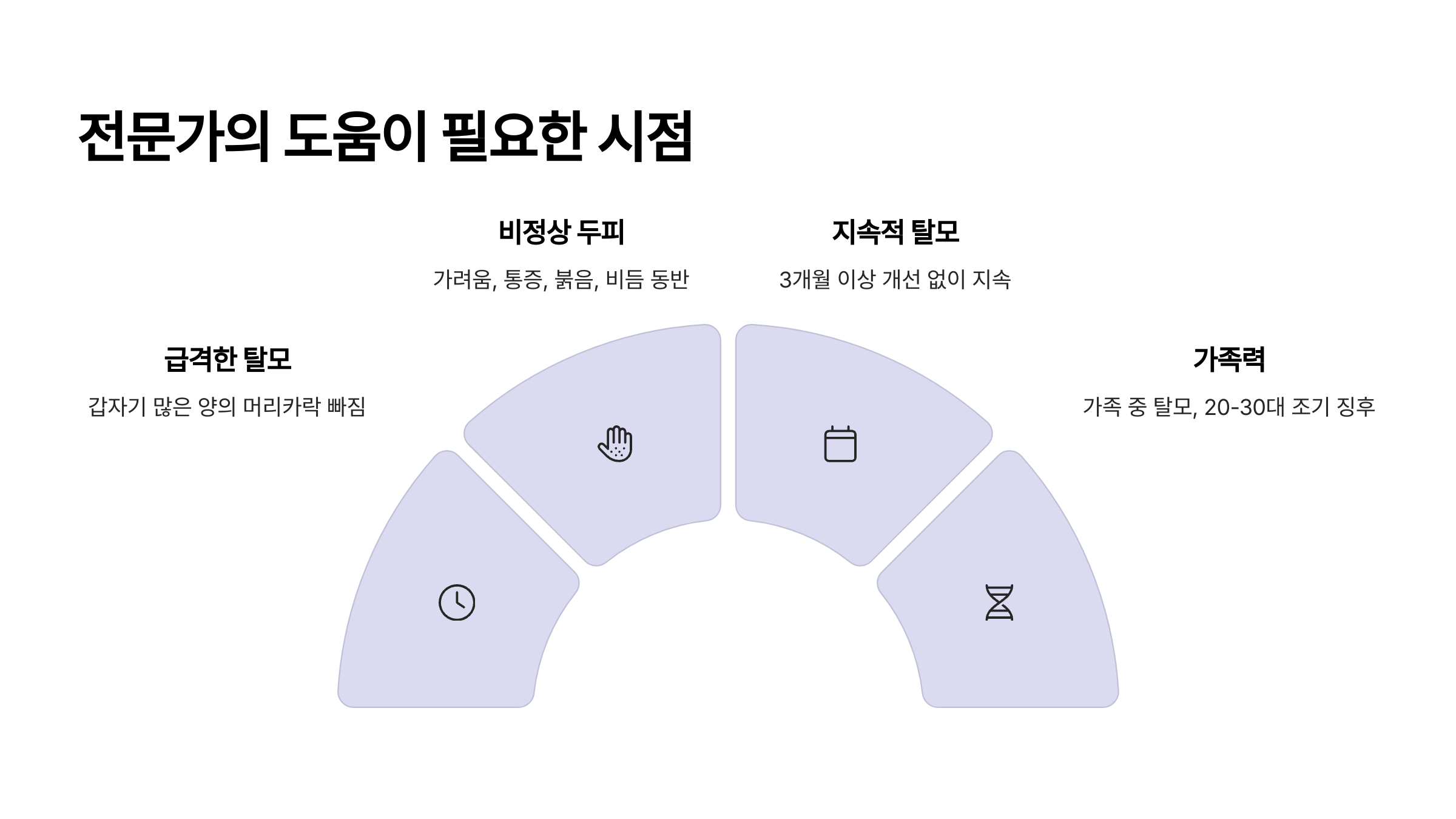 처음에는 "아직 심각한 단계는 아니잖아"라고 생각했는데, 나중에 알고 보니 초기에 관리했으면 더 효과적으로 탈모를 억제할 수 있었다고 해요. 그래서 다음과 같은 상황에서는 반드시 전문가를 찾아보시길 권장합니다.