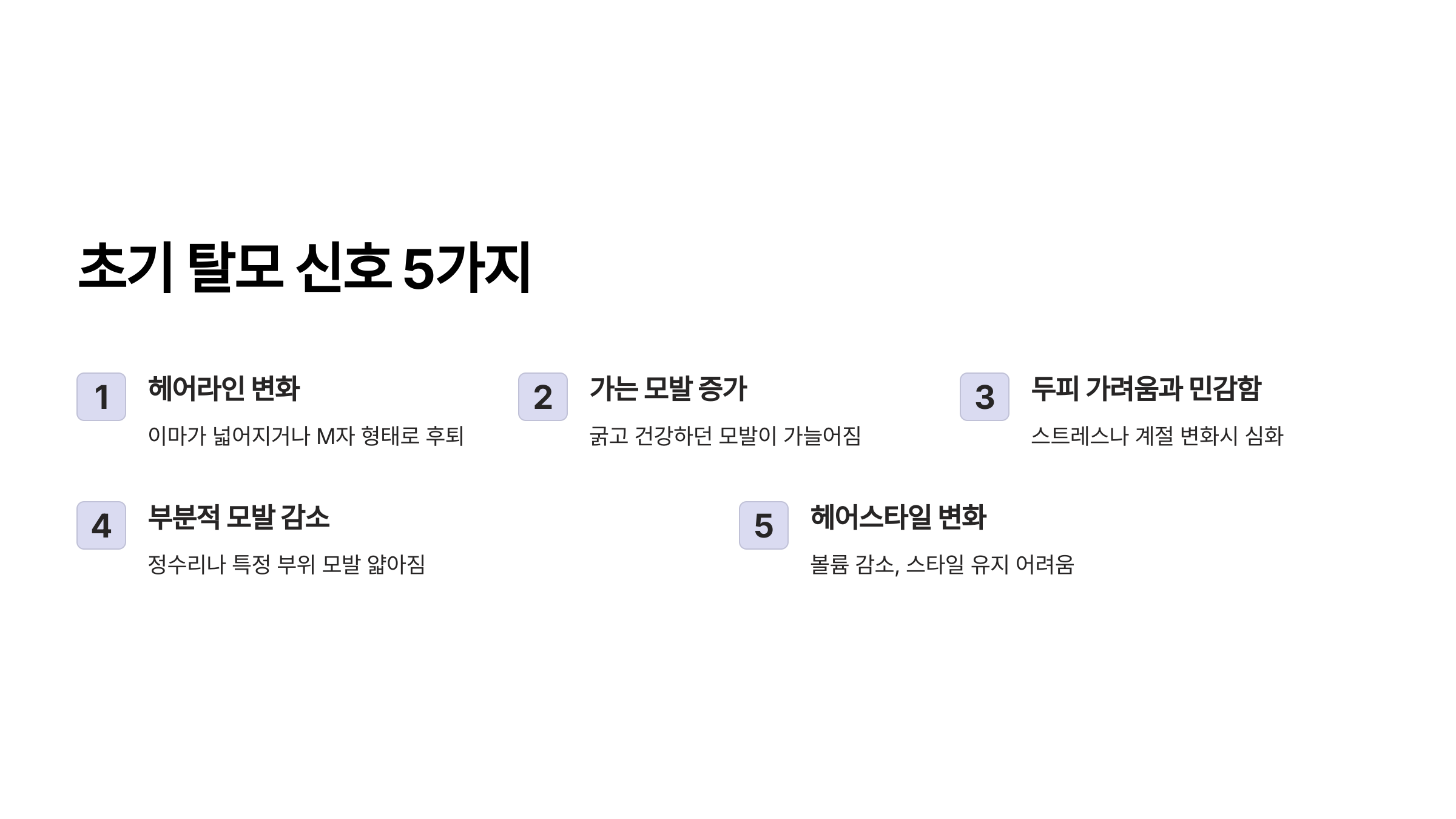 5. 헤어스타일 변화: 평소처럼 스타일링을 해도 볼륨이 잘 살지 않거나, 스타일이 빨리 무너지는 경우가 많아져요. 머리를 감고 말려도 예전 같지 않다면 탈모를 의심해볼 필요가 있어요.