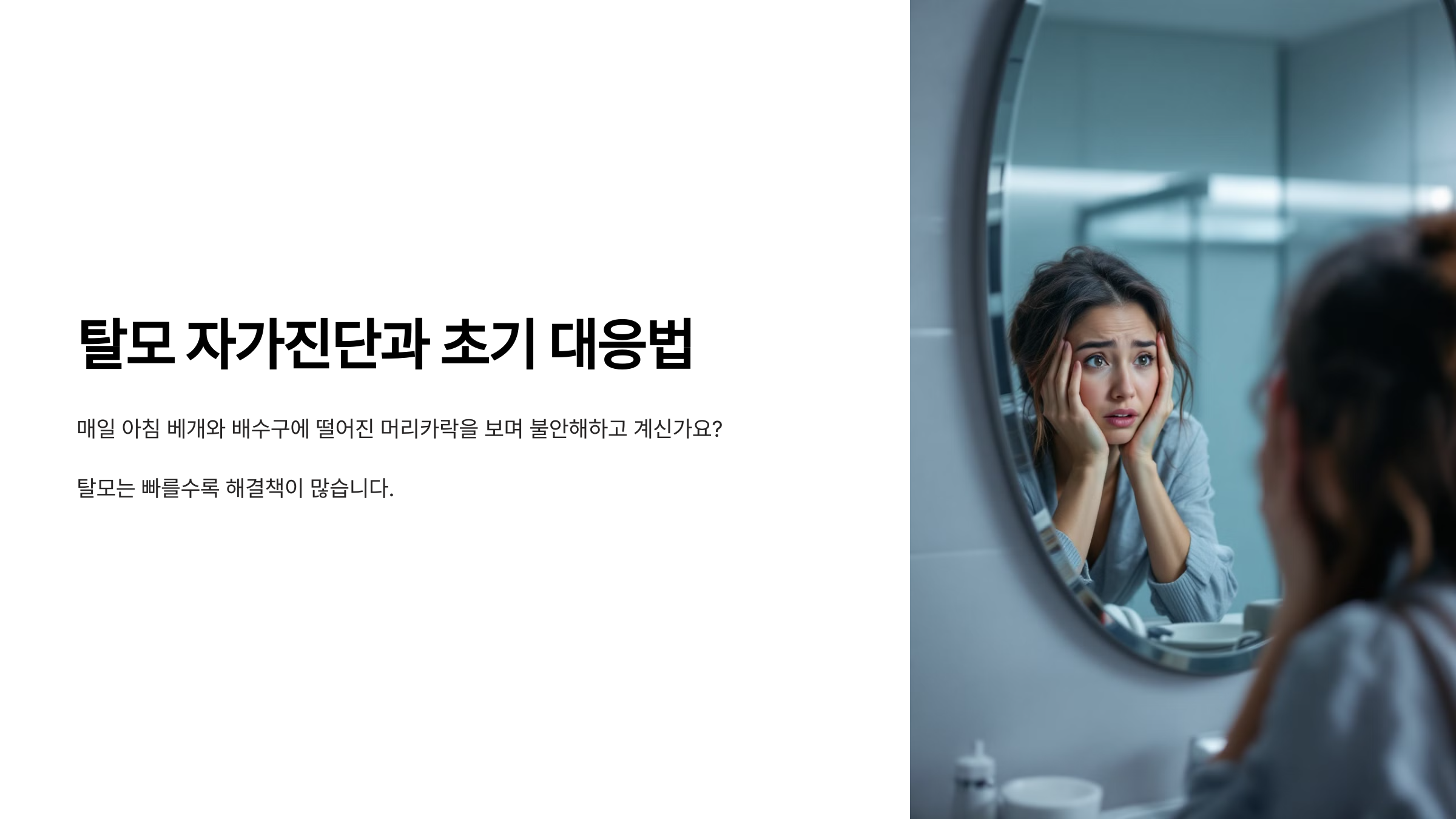 매일 아침 베개와 배수구에 떨어진 머리카락을 보며 불안해하고 계신가요? 탈모는 빠를수록 해결책이 많습니다.
