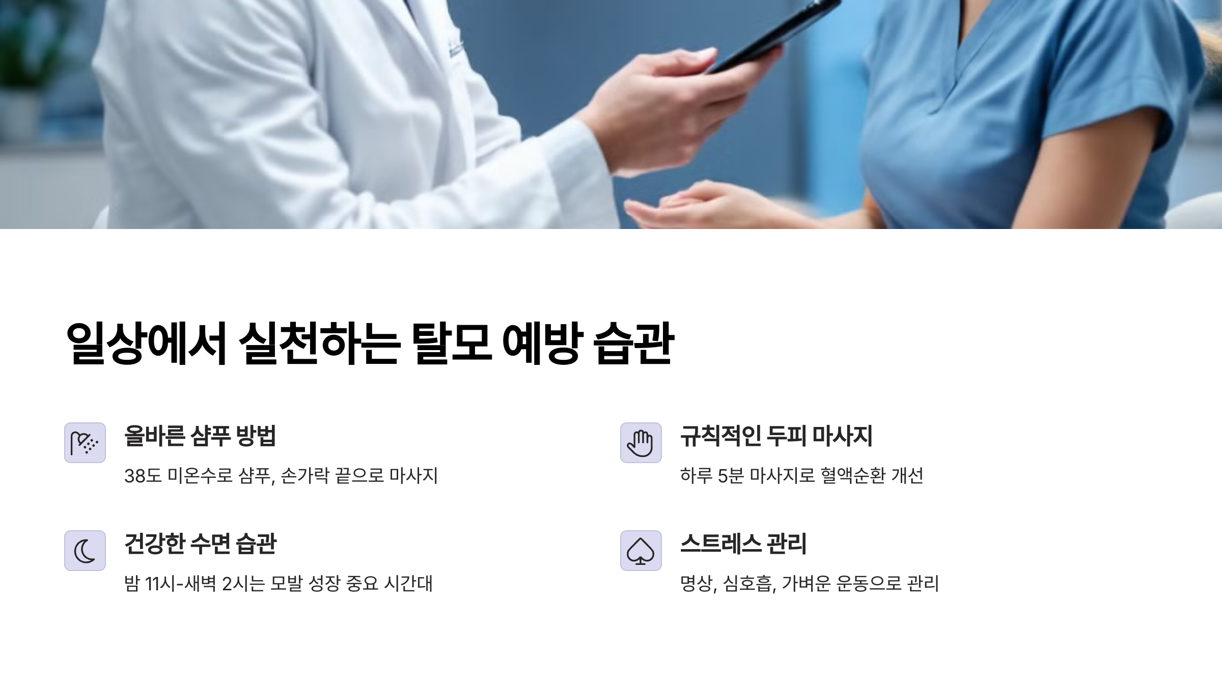 - 스트레스 관리하기만성적인 스트레스는 탈모의 주요 원인 중 하나에요. 명상, 심호흡, 가벼운 운동, 취미 활동 등으로 스트레스를 관리하세요. 저는 하루 10분 명상이 정말 도움이 됐어요.