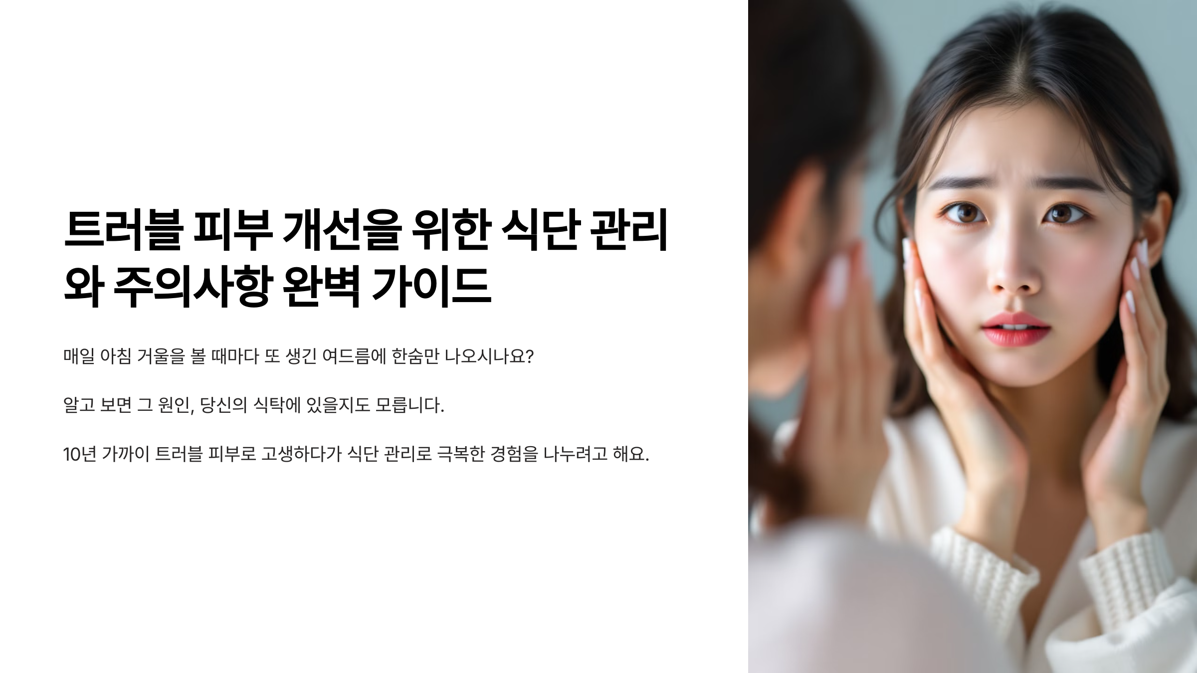 안녕하세요, 여러분! 오늘은 제가 10년 가까이 트러블 피부로 고생하다가 식단 관리로 극복한 경험을 나누려고 해요. 지난 겨울, 특히 심했던 턱라인 여드름으로 정말 속상했는데요. 피부과 치료와 함께 식단을 철저히 바꾸고 나서야 드디어 개선되기 시작했어요. 이제 그 노하우를 여러분과 공유하고 싶어요. 솔직히 말해서, 식단 관리가 처음엔 너무 힘들었지만... 결과는 정말 놀라웠답니다!