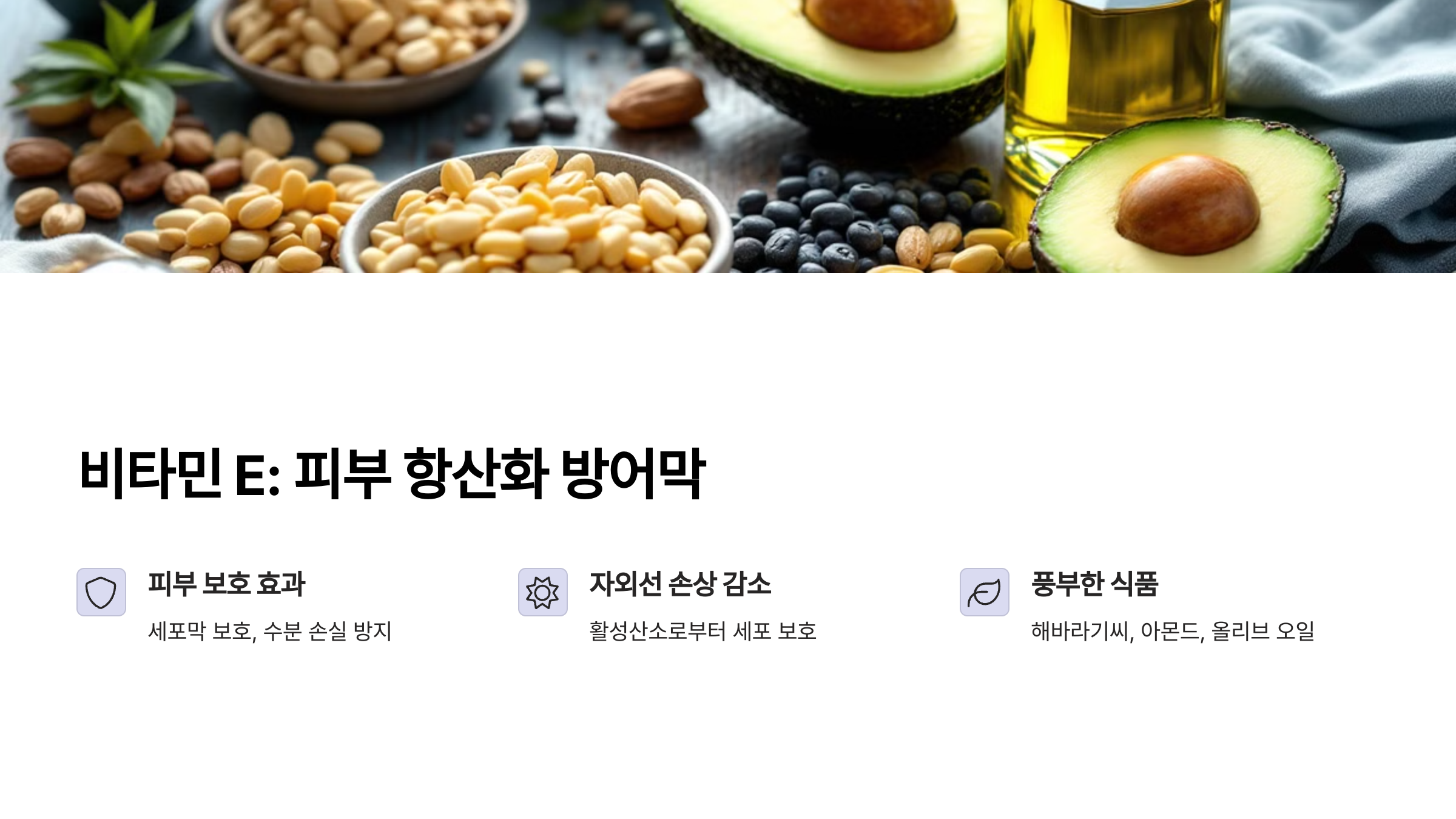 비타민 E는 지용성 비타민으로, 피부 세포막을 보호하고 수분 손실을 방지해줘요. 특히 자외선으로 인한 손상을 줄여주는 효과가 탁월하죠. 거기다 피부 노화의 주범인 활성산소로부터 세포를 지켜주는 슈퍼 항산화제이기도 합니다.