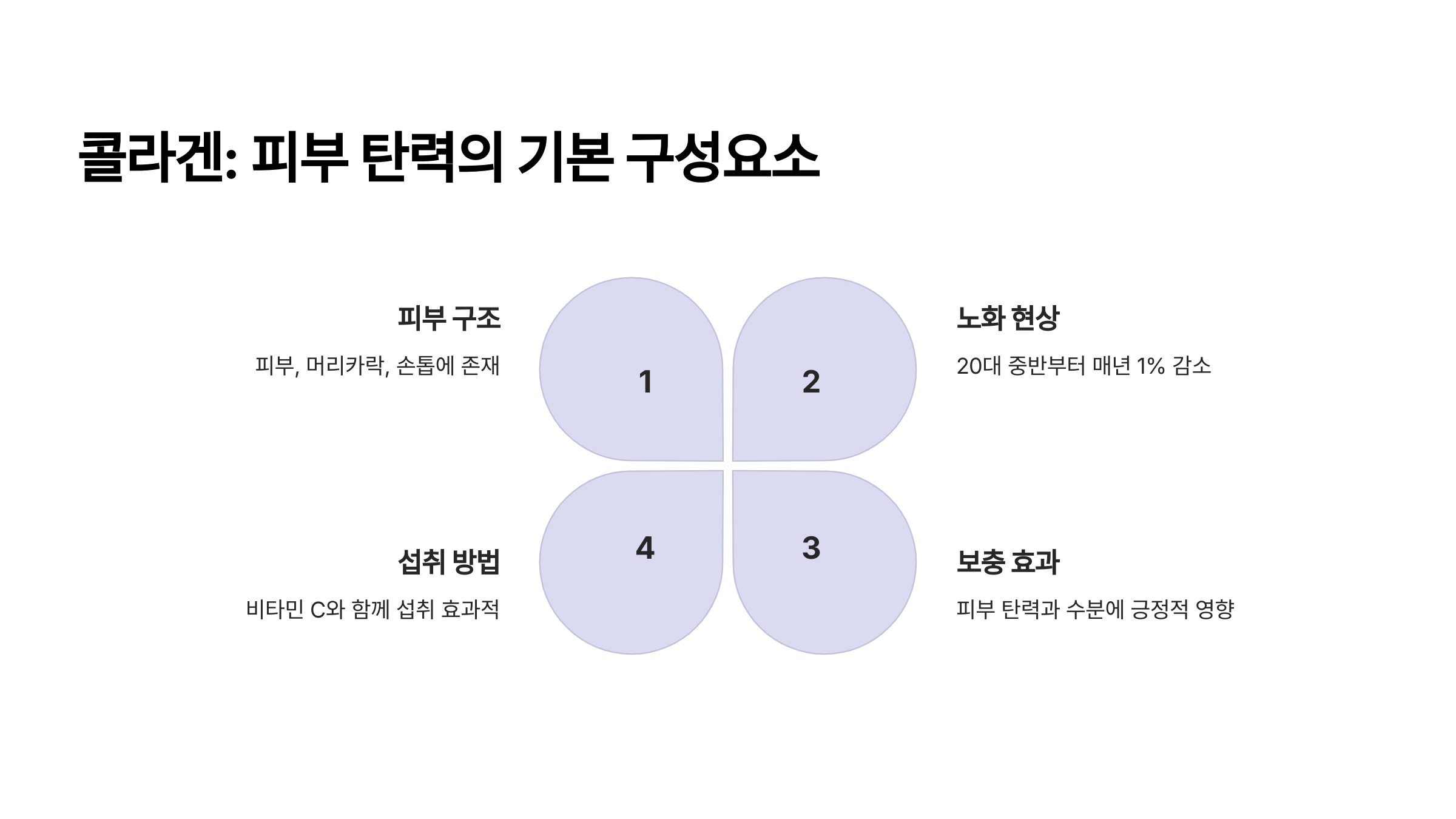 콜라겐은 우리 몸에서 가장 풍부한 단백질로, 피부, 머리카락, 손톱, 관절, 뼈 등 거의 모든 조직에 존재해요. 특히 피부의 진피층에 있는 콜라겐은 피부에 구조와 탄력을 제공하는 중요한 역할을 합니다. 문제는 나이가 들면서 체내 콜라겐 생산이 감소한다는 거죠. 20대 중반부터 매년 약 1%씩 콜라겐 생산량이 줄어든다고 해요. 그래서 나이가 들수록 피부가 처지고 주름이 생기는 거구요.