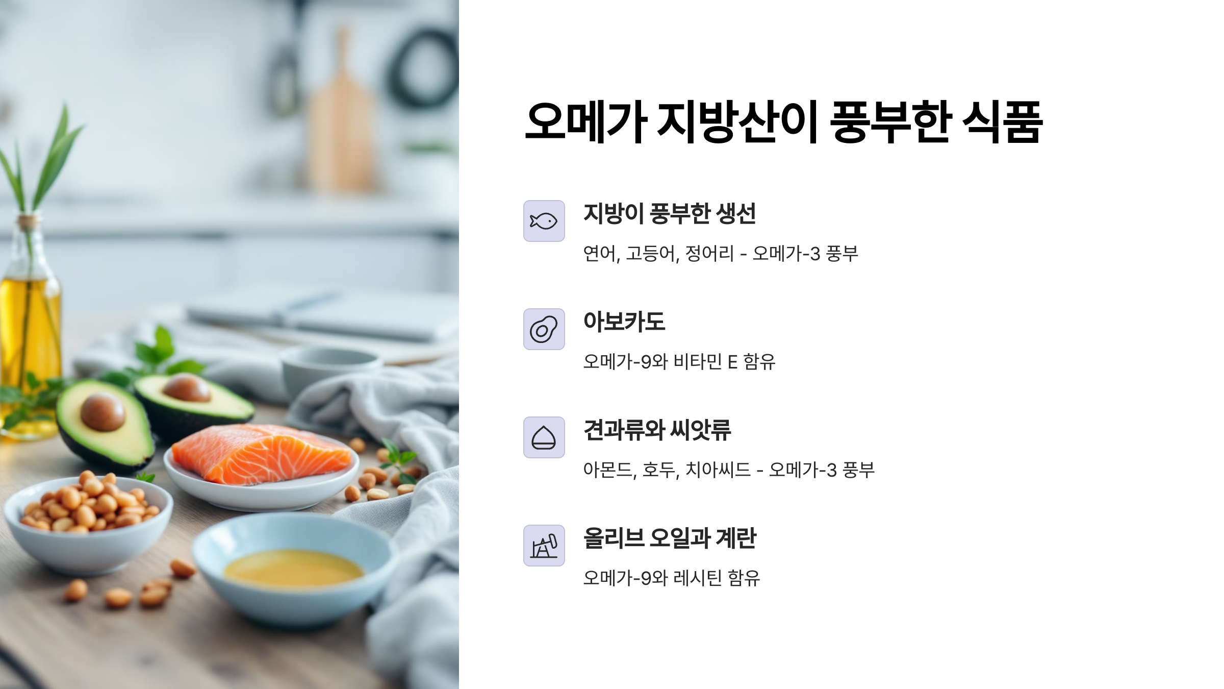 여기 오메가 지방산이 풍부한 슈퍼푸드 리스트를 정리해봤어요. 이 음식들을 식단에 자주 포함시키면 피부 장벽 강화에 큰 도움이 될 거예요.