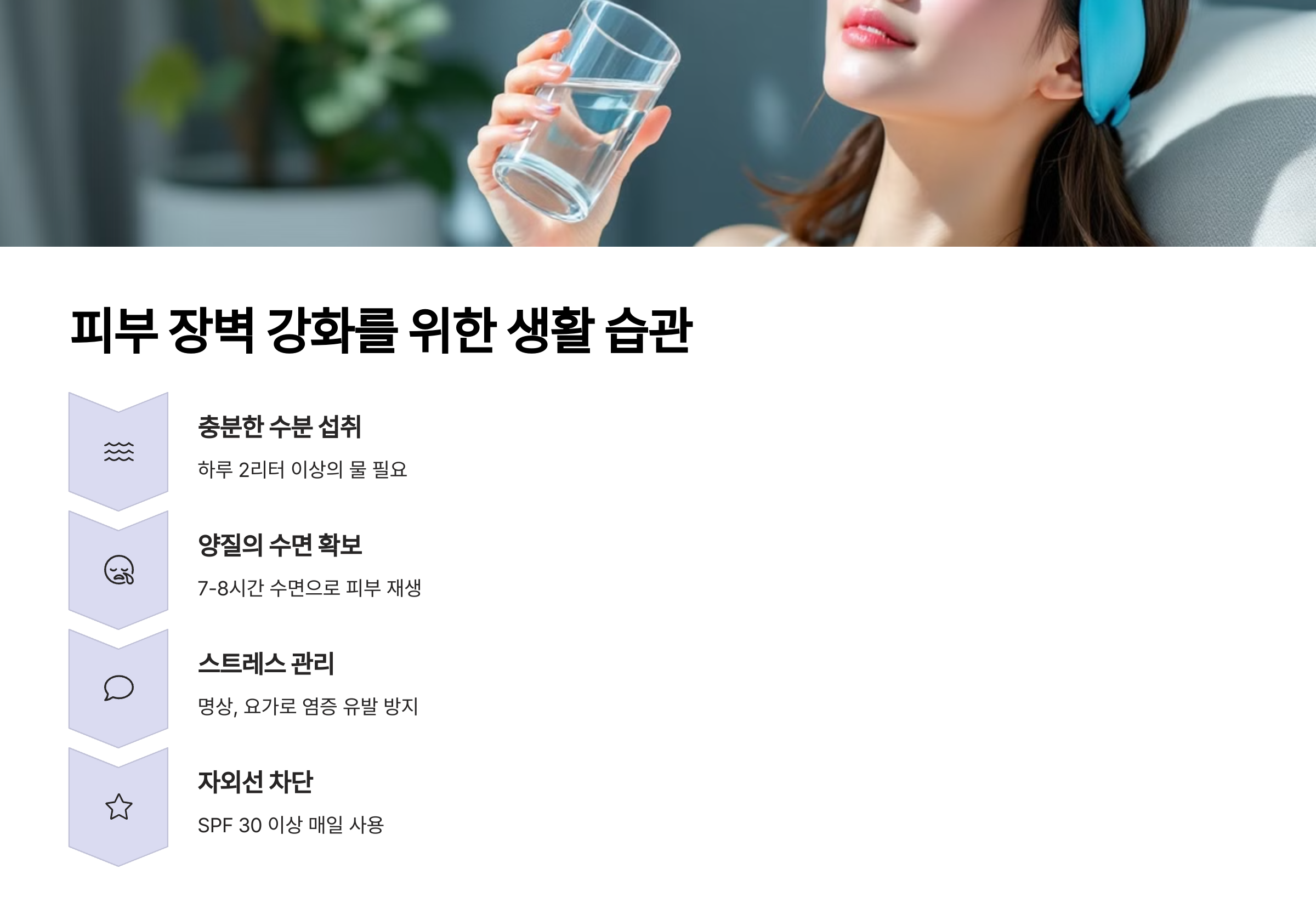 슈퍼푸드를 통한 영양 섭취도 중요하지만, 일상 생활 습관도 피부 장벽에 큰 영향을 미친답니다. 아무리 좋은 음식을 먹어도 다른 생활 습관이 피부 장벽을 계속 손상시킨다면 효과를 보기 어렵겠죠? 음식과 함께 이런 습관들도 함께 개선해보세요.