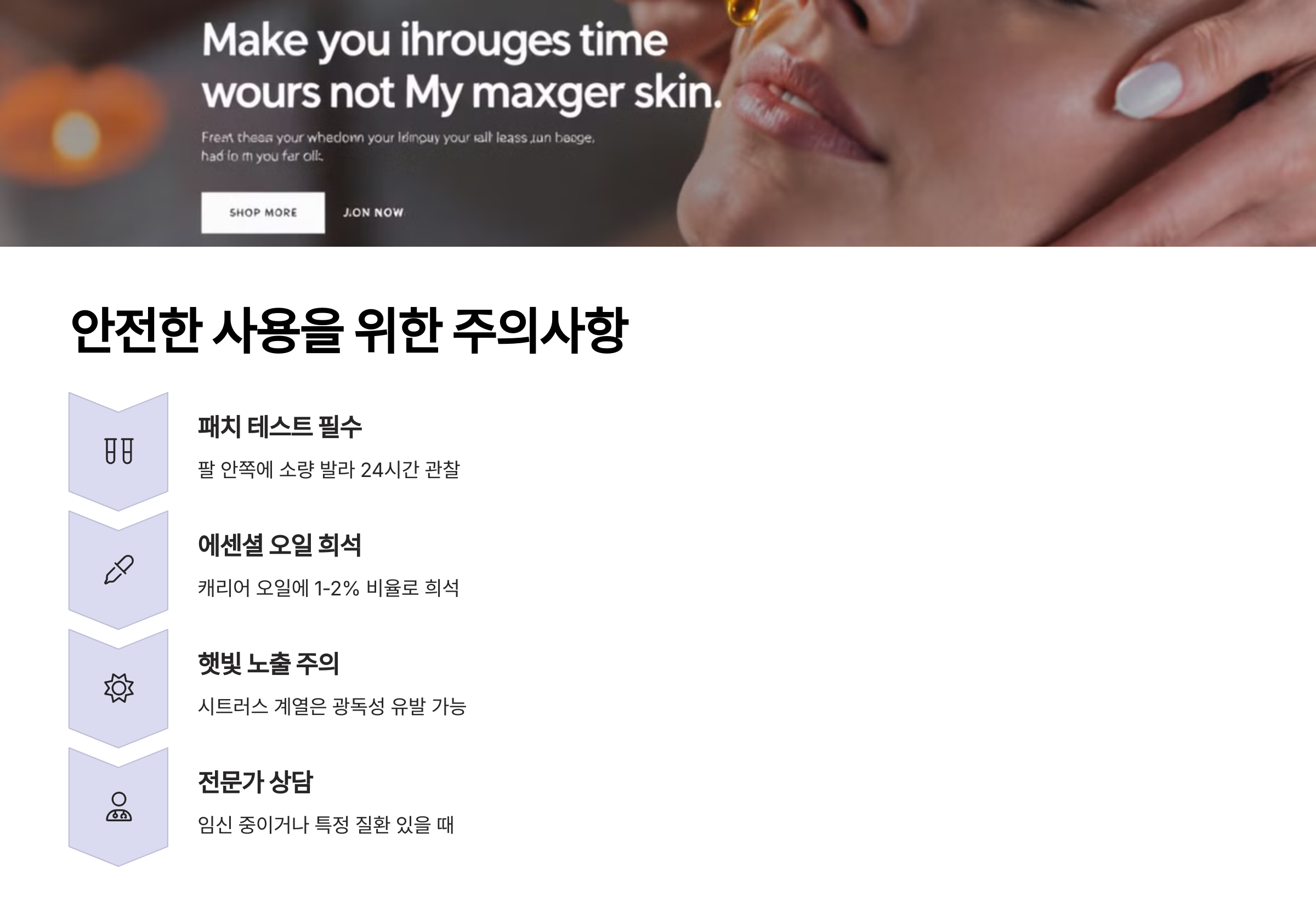 - 에센셜 오일은 반드시 희석하세요 - 에센셜 오일은 매우 농축된 형태로, 절대 직접 피부에 바르면 안 돼요. 항상 캐리어 오일(호호바, 아르간 등)에 1-2% 비율로 희석해서 사용하세요.
