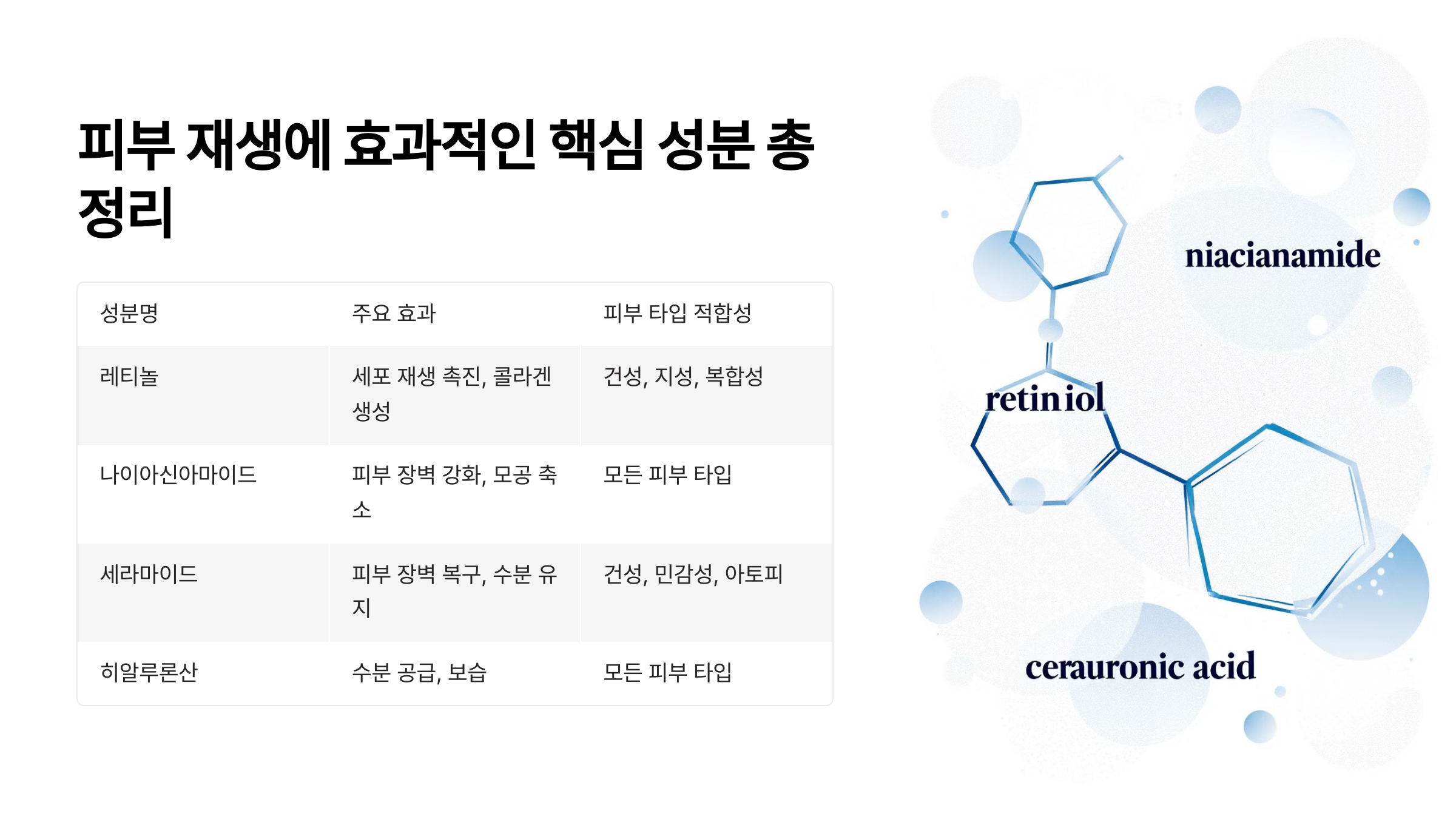 그런데 알고 보니 완전히 허풍은 아니더라구요. 피부 재생이란 간단히 말해서 손상된 피부 장벽을 회복시켜 피부가 스스로 건강해질 수 있도록 돕는 과정을 말해요. 우리 피부는 원래 스스로 재생하는 능력이 있지만, 나이가 들거나 외부 자극에 많이 노출되면 그 능력이 떨어지게 됩니다.
