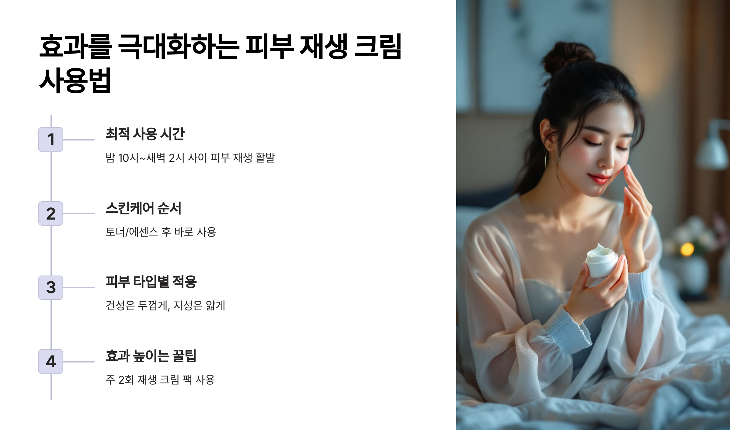 우리 피부는 밤 10시~새벽 2시 사이에 가장 활발하게 재생된다고 해요. 이 시간대에 수면을 취하면서 재생 크림이 피부에 작용할 수 있도록 하는 것이 가장 효과적이에요. 아침보다는 저녁 스킨케어에 재생 크림을 포함시키는 것이 좋습니다.