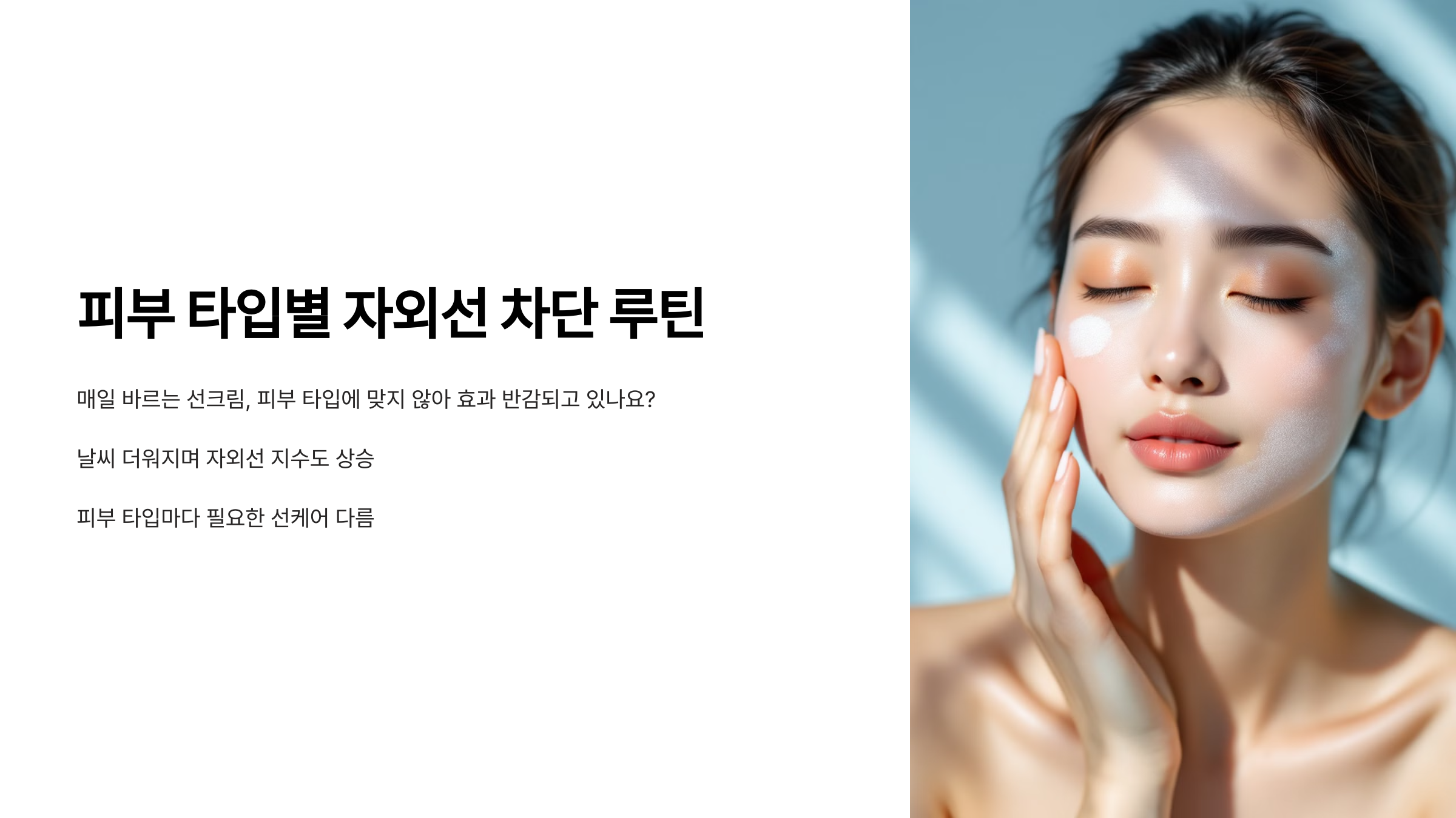 안녕하세요, 여러분! 요즘 날씨가 점점 더워지면서 자외선 지수도 함께 올라가고 있죠. 저는 지난주 해변가에 다녀온 후 제대로 선케어를 안 해서 얼굴이 새우처럼 빨개진 슬픈 경험이 있어요. 그 이후로 피부 타입에 맞는 자외선 차단제 사용법에 대해 공부했는데, 정말 피부 타입마다 필요한 선케어가 다르더라구요! 오늘은 제가 알게 된 피부 타입별 자외선 차단 루틴을 여러분과 나누고 싶어요.