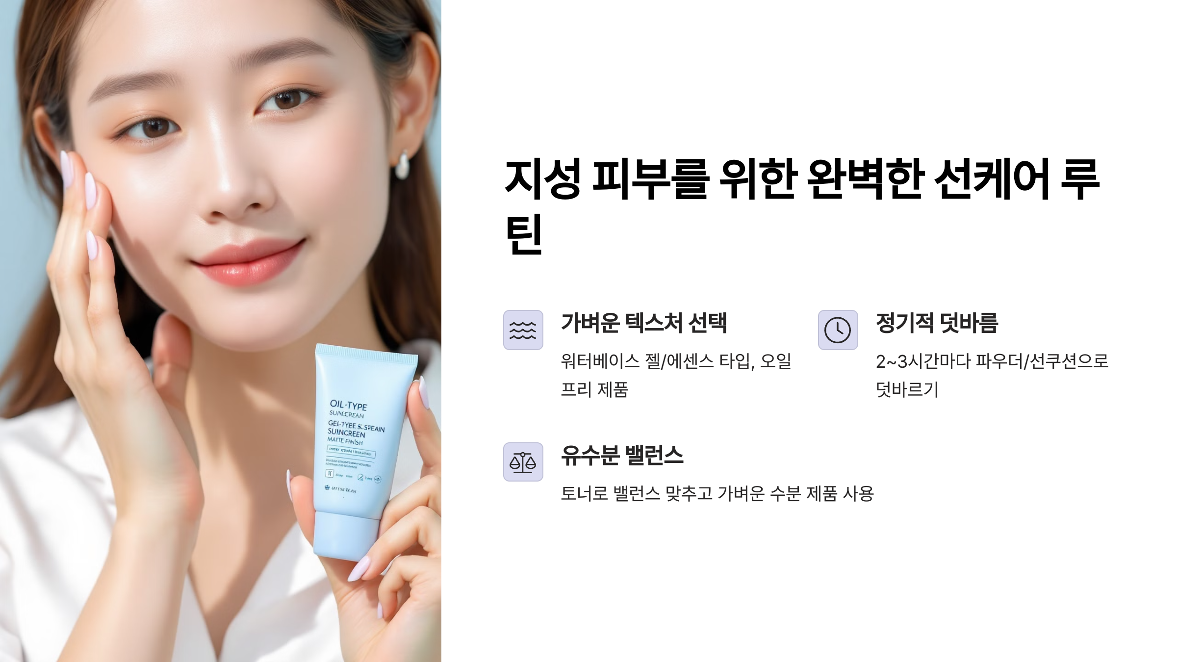 지성 피부 분들의 가장 큰 고민, 바로 선크림 발랐을 때 번들거림이죠. "선크림 바르면 얼굴이 기름칠한 것 같아요"라는 말 정말 많이 들어요. 하지만 걱정 마세요! 지성 피부도 번들거림 없이 자외선 차단이 가능해요.