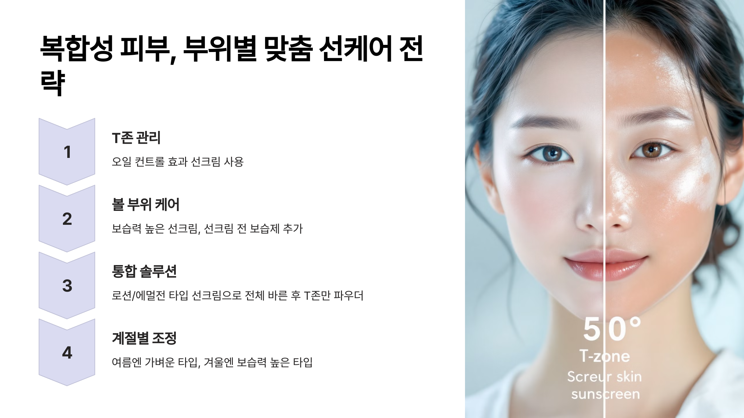 저는 예전엔 복합성 피부를 관리하기 너무 어려워서 스트레스받았는데, 지금은 오히려 장점으로 생각해요. 다양한 제품을 시도해볼 수 있고, 부위별로 다른 케어가 가능하니까요. 여러분도 자신의 피부 상태를 잘 관찰하고 맞춤형 선케어를 찾아보세요!